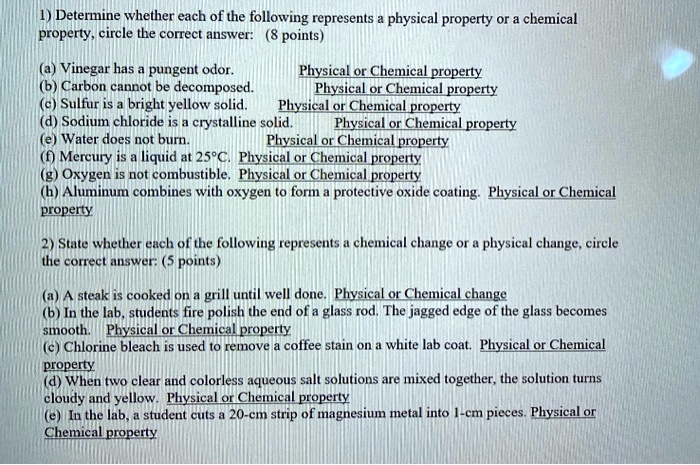 Solved Determine Whether Each Of The Following Represents Physical Property Or Chemical Property Circle The Correct Answer Points Vinegar Has Pungent Odor Physicalo Chemicalproperty Carbon Cannot Be Decomposed Physical Or Chemical Property